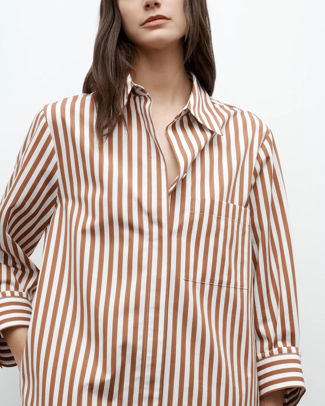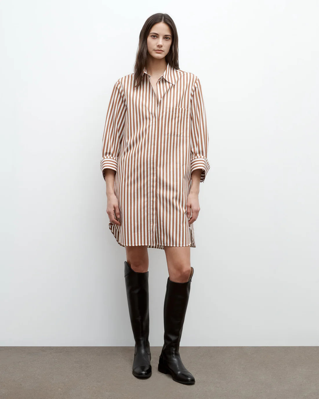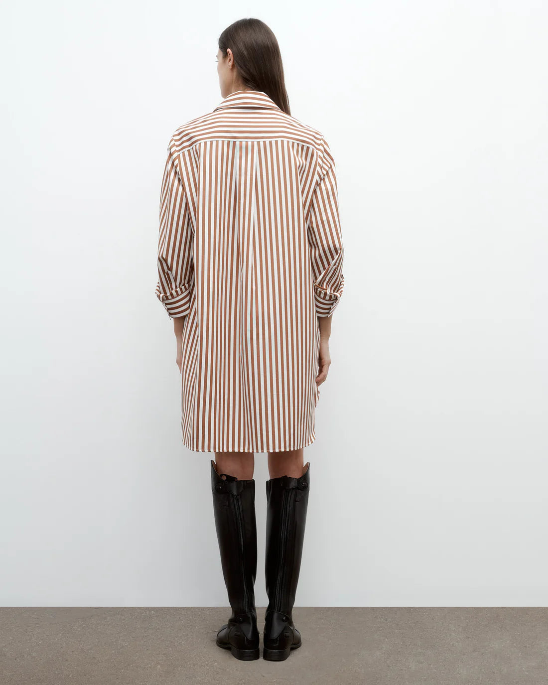 Mini shirt dress in bold striped Italian cotton shirting. The Morning After dress is a relaxed, boxy silhouette. Complete with a concealed button placket, chest patch pocket, and our signature wide rolled up button cuffs.