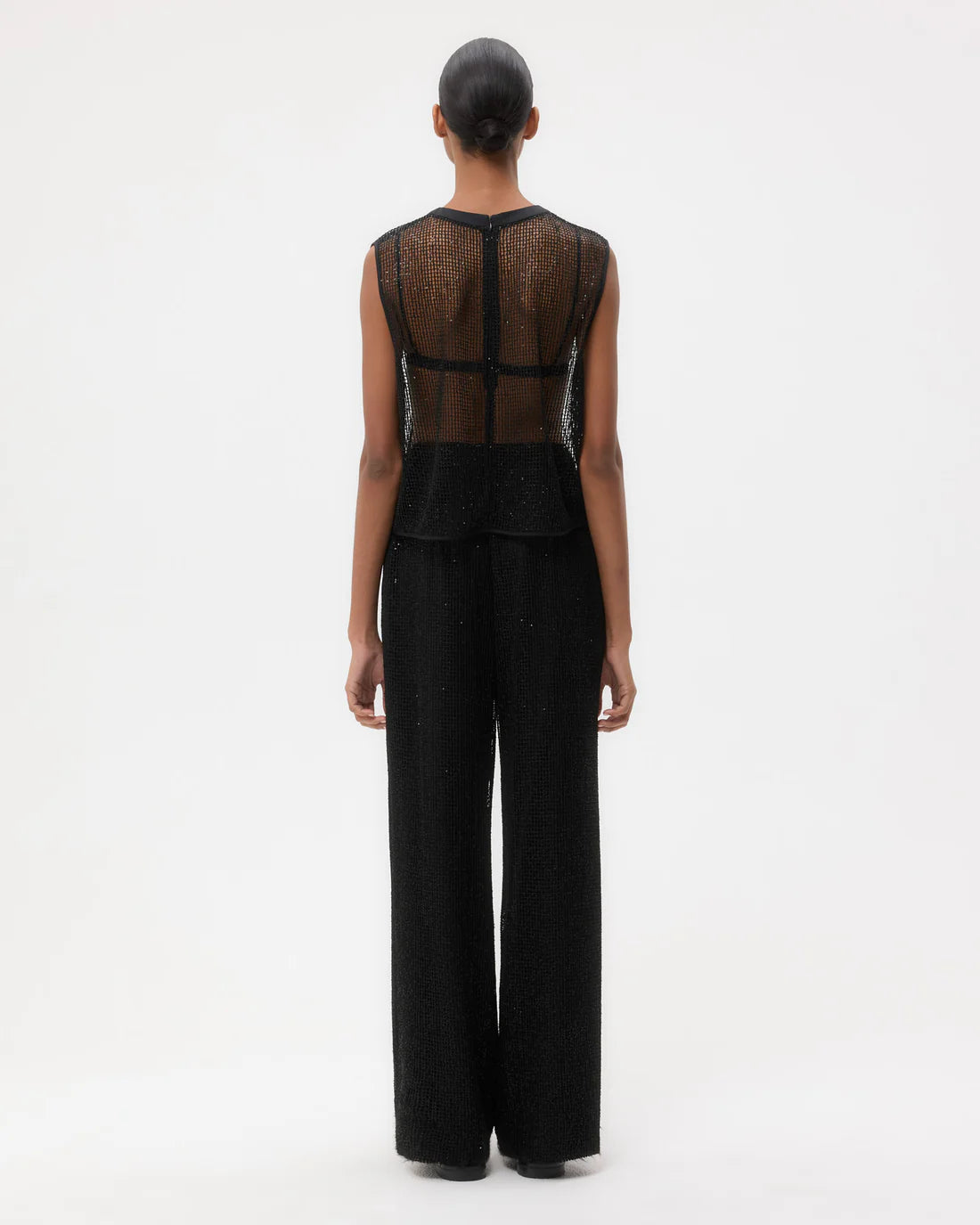 Mid-rise, wide-leg trousers in mini sequin netting. Fabric is lightweight netting with sequin embellishments throughout for a subtle shine, lined in wool twill. Relaxed through the hip and leg with front pleats for added volume. Complete with belt loops, side pockets, and a concealed zip-fly with hook-and-eye closure.