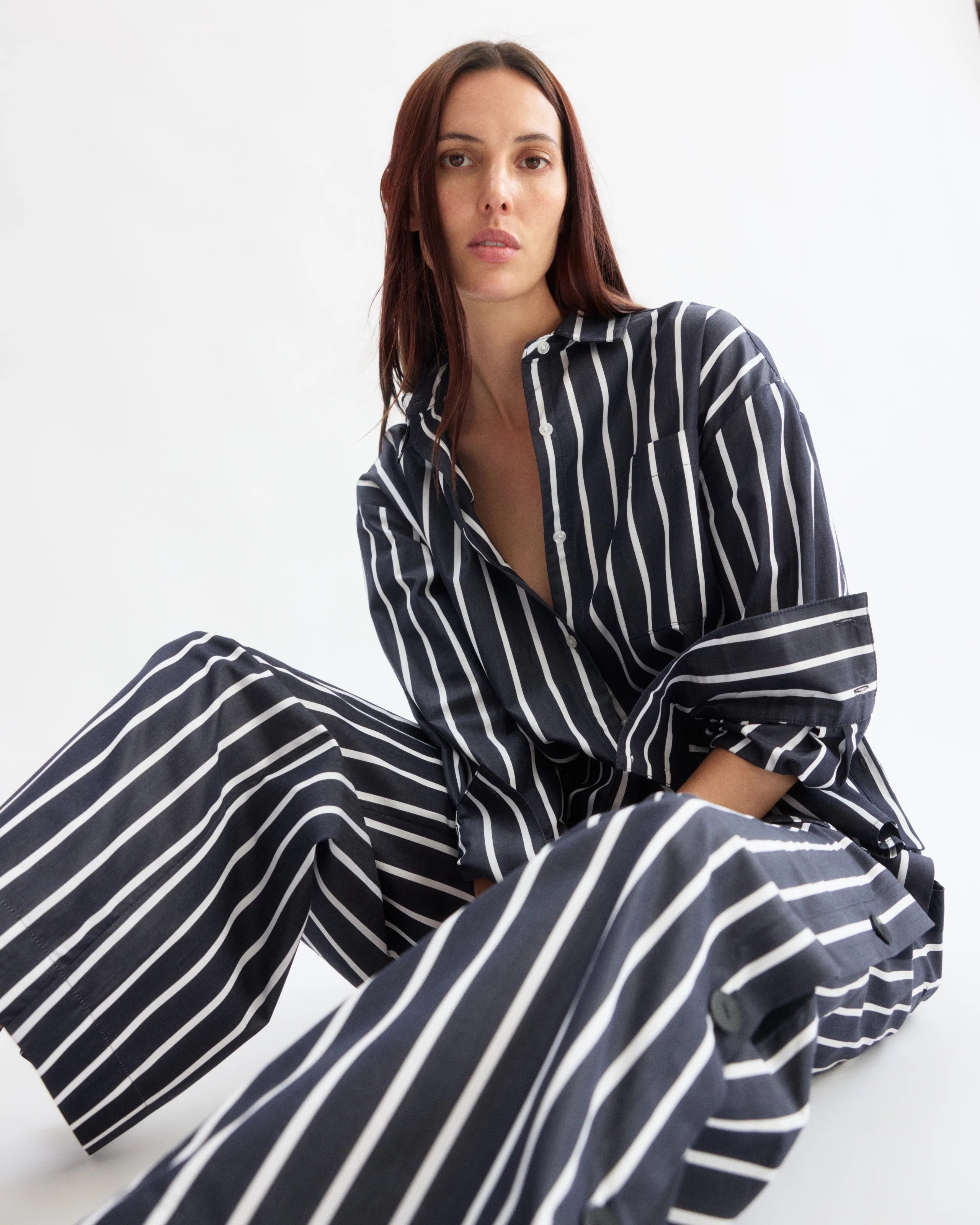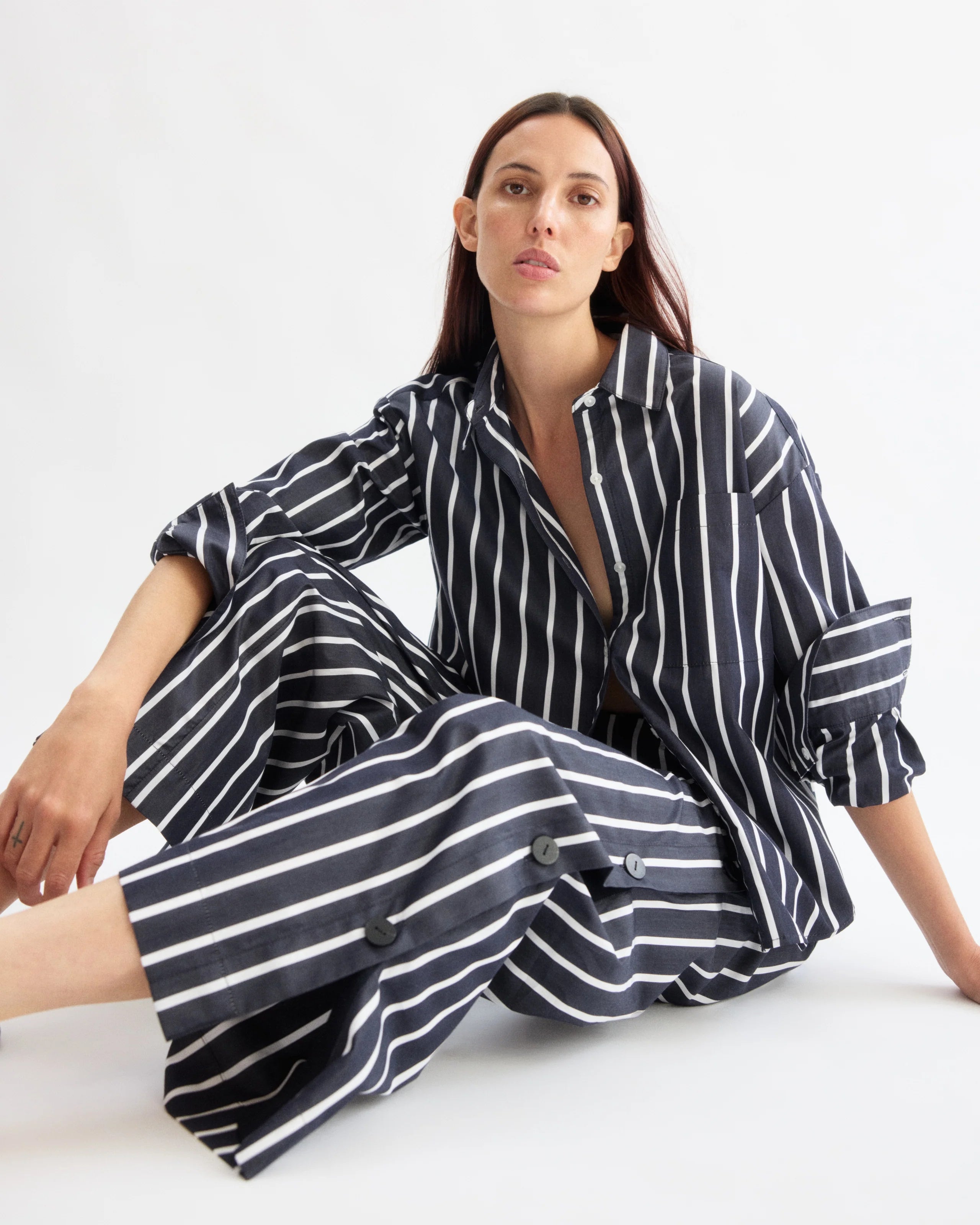 The Baxter pant features an elastic pull-on waist with real horn side buttons up the entire length of the full leg. We lined the interior placket with tonal grosgrain ribbon for a beautiful finish. Pair with our Hester or Watts Shirt for a full set.