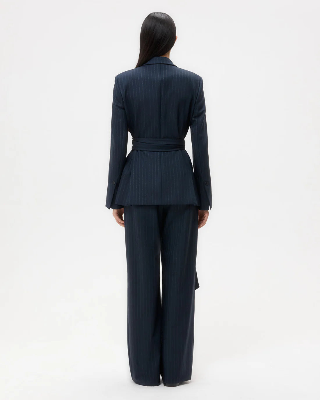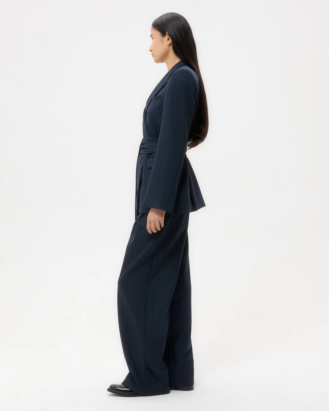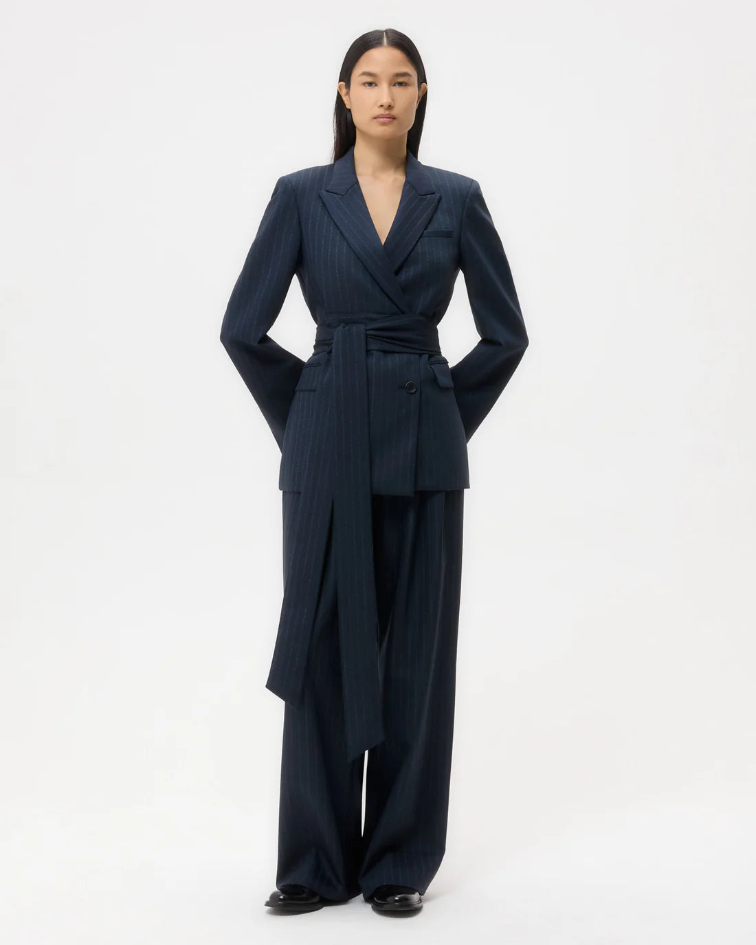 Double-breasted blazer in stretch wool. The fabric is a viscose-wool blend with a touch of stretch for ease. Designed with strong shoulders and a relaxed, boxy silhouette. Finished with peak lapels, a chest welt pocket, flap side pockets, and a self-tie belt to define the waist.