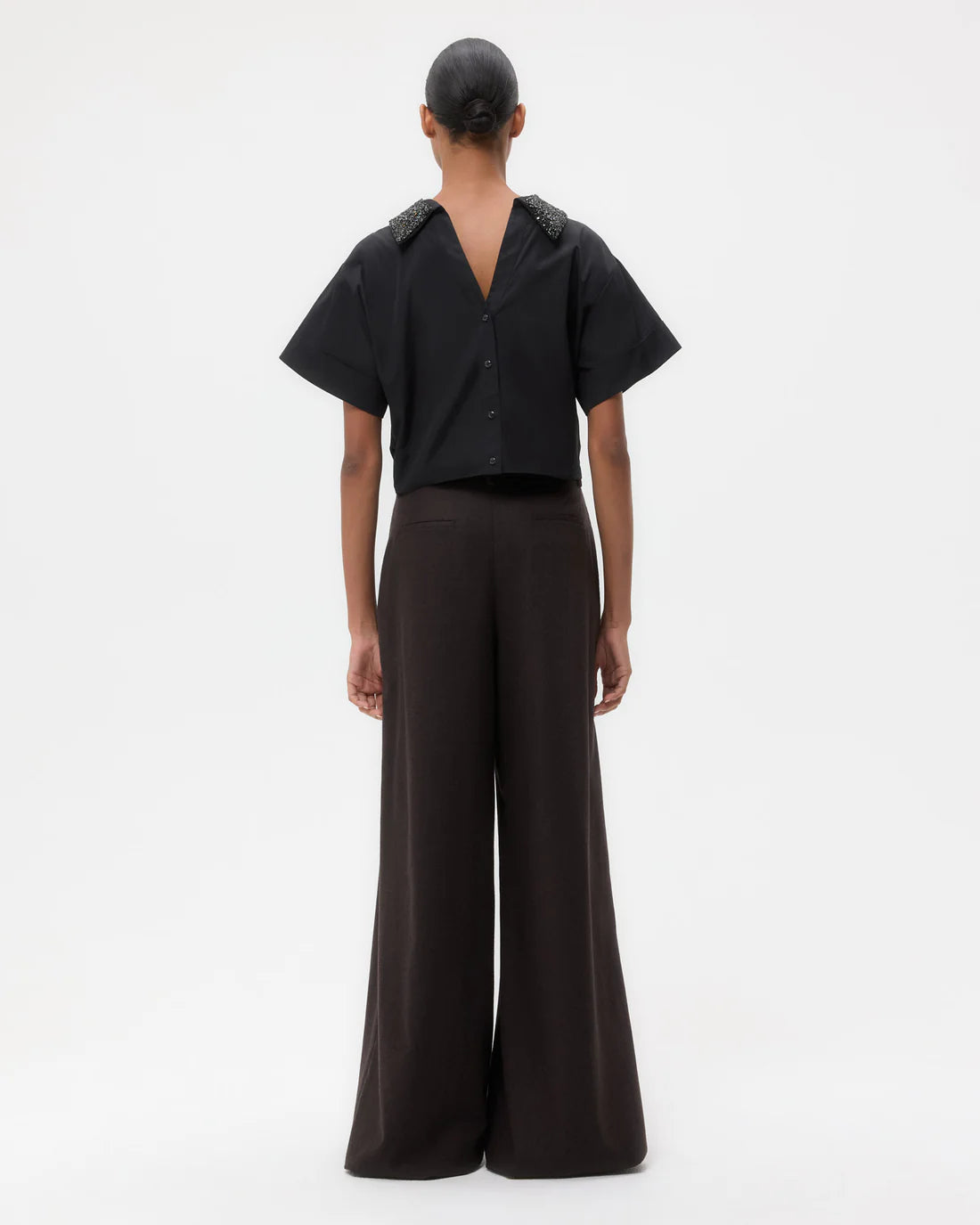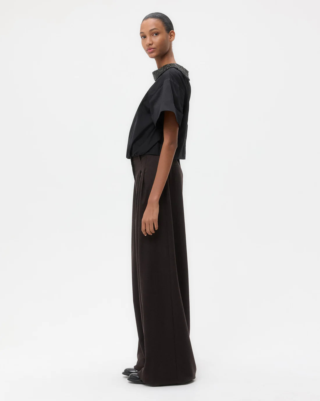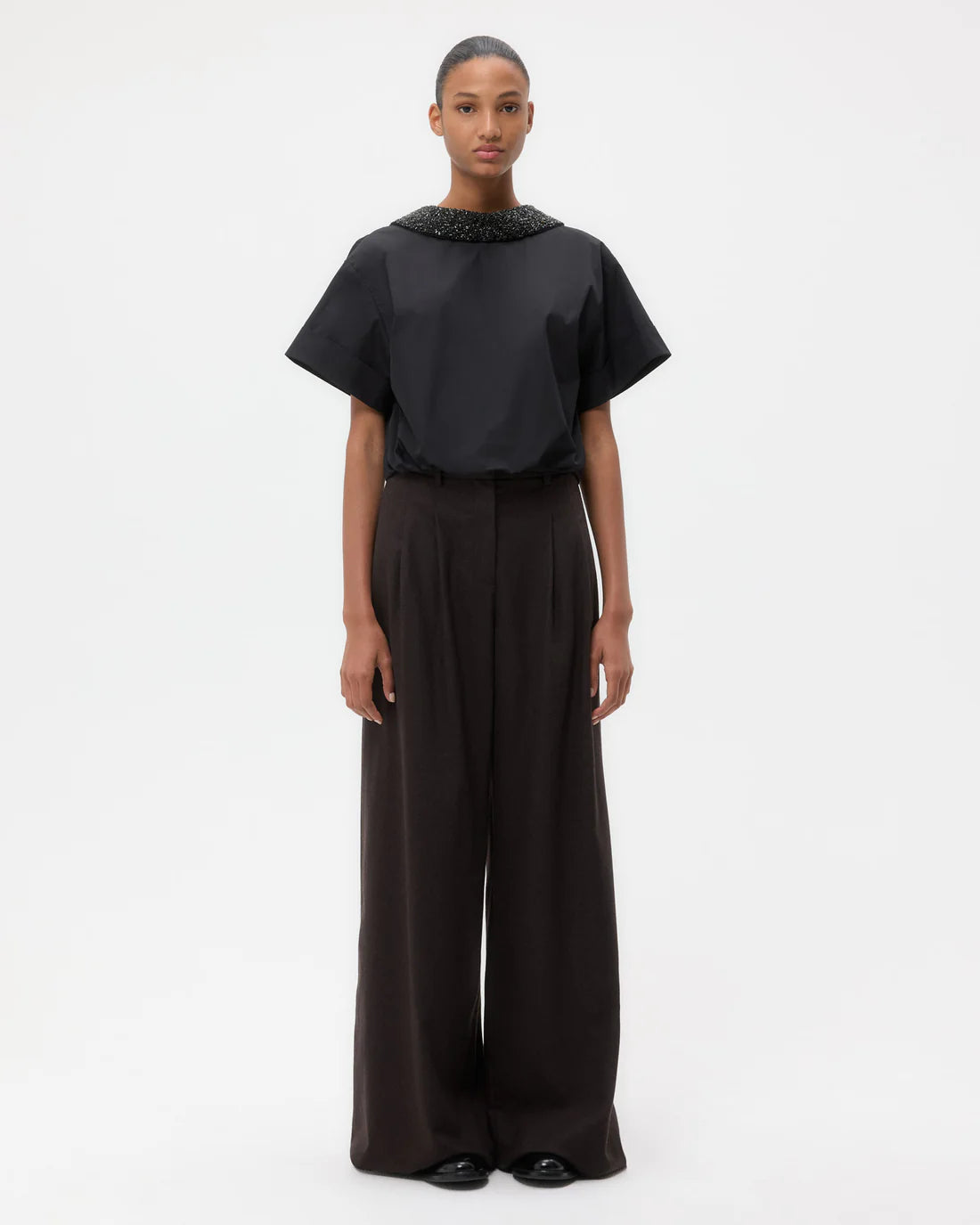 Mid-rise, wide leg pleated trouser in wool flannel. This fabric is cashmere/wool blend with a touch of stretch for comfort and ease. Avery Pant is relaxed through the hip and leg. Complete with side pockets, back welt pockets, belt loops, concealed zip, and hook and eye closure.