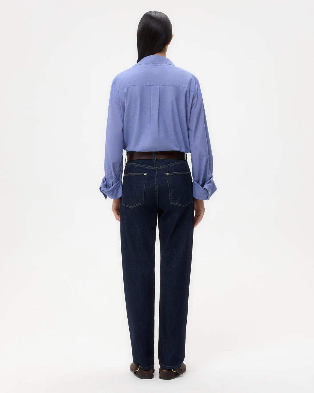 Dark-wash, high-rise, straight-leg jeans in authentic washed heavy denim. Relaxed at the hip and through the leg. Complete with five-pocket styling, custom metal rivets, zip-fly, belt loops, metal shank, and contrast stitching at the seams.