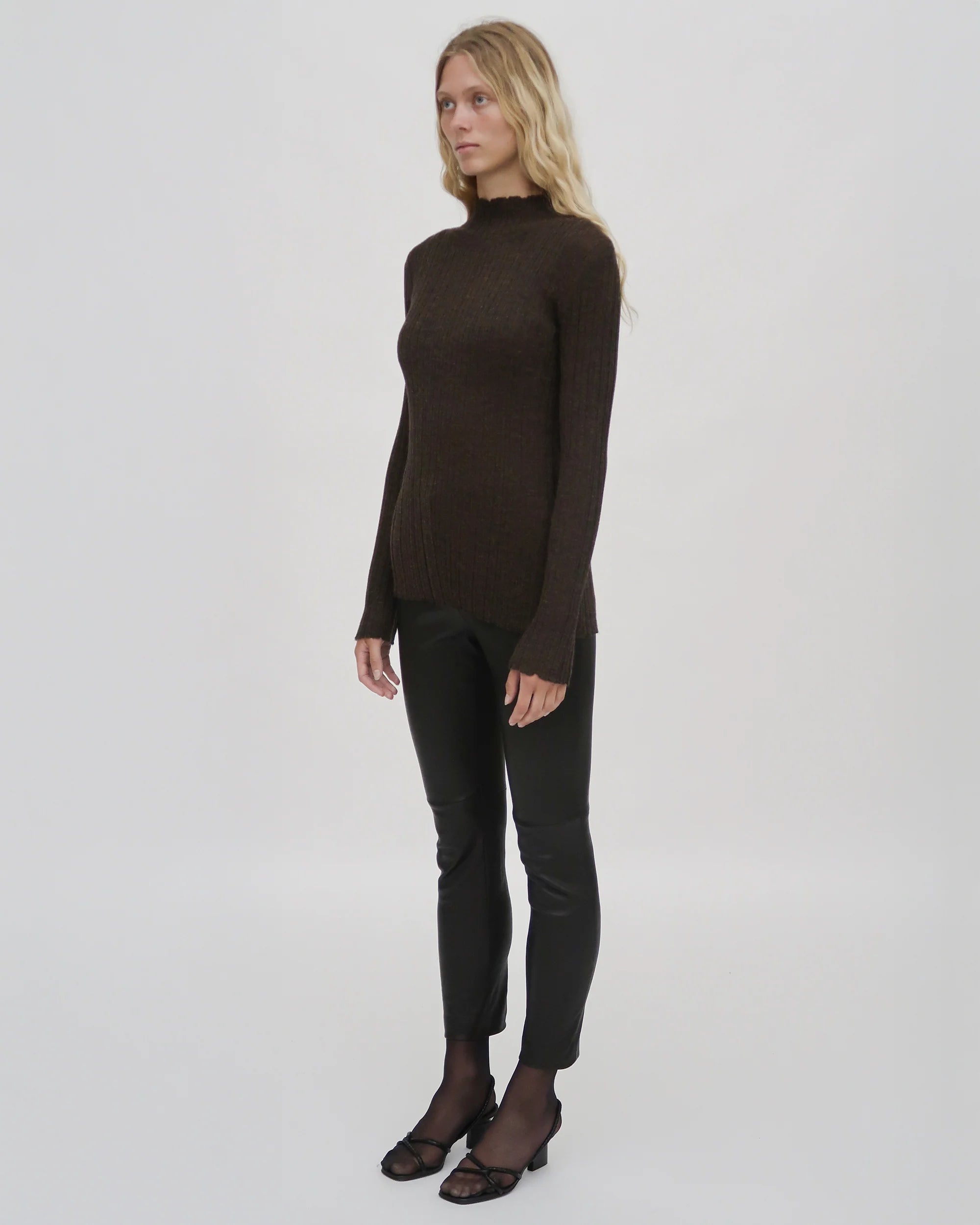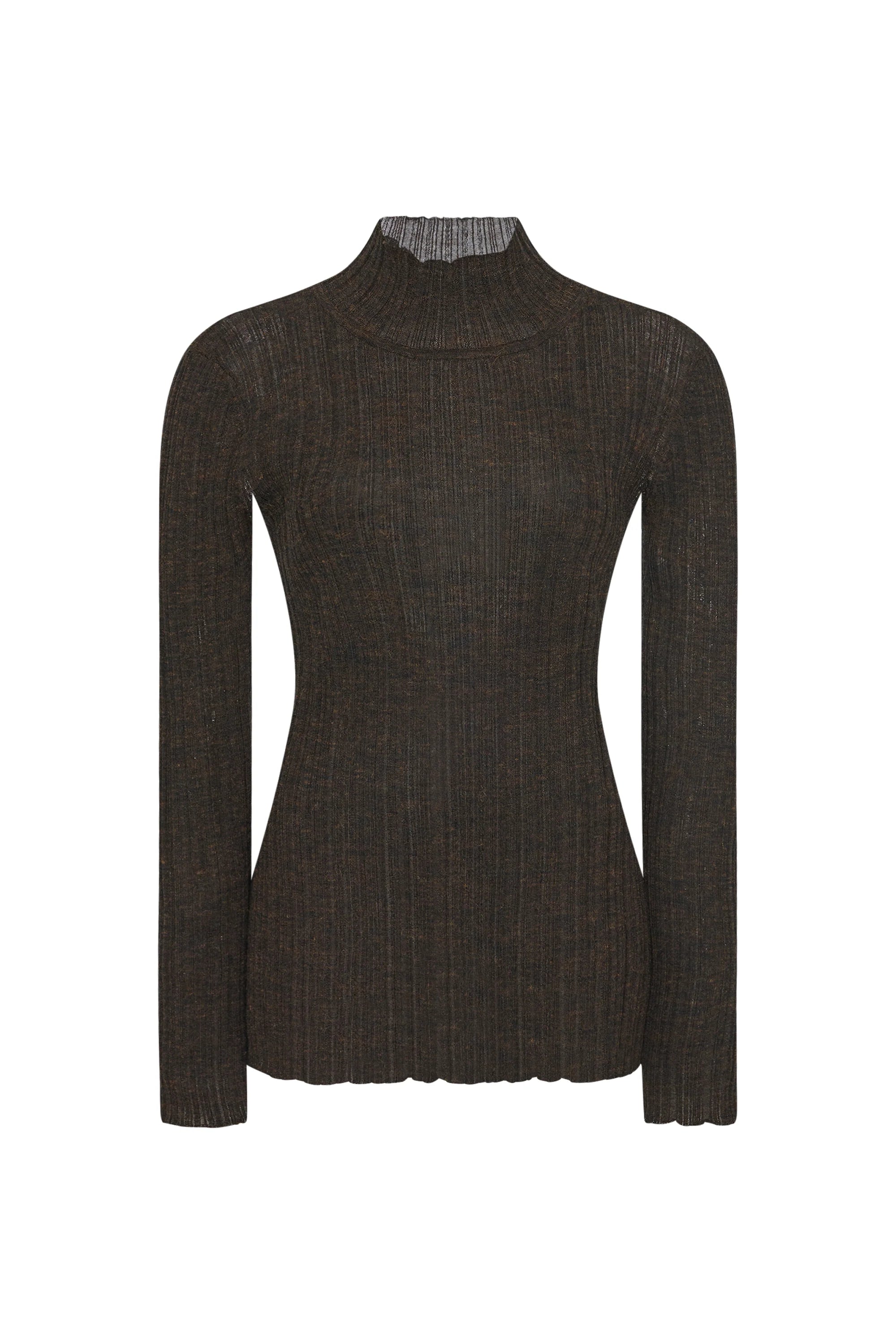 Lightweight texture with sculptural depth. This plissé turtleneck is crafted from airy alpaca gauze, offering a semi-sheer finish with dimensional pleating throughout. The rich tones create a tonal interplay that’s subtle yet striking. Designed for layering, its slim silhouette and soft structure lend quiet drama to both tailored and relaxed looks.