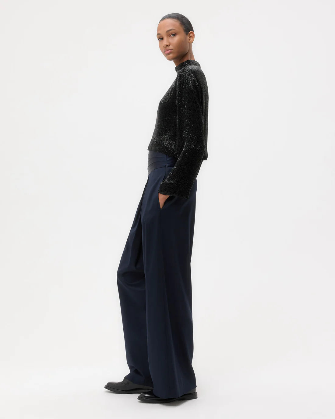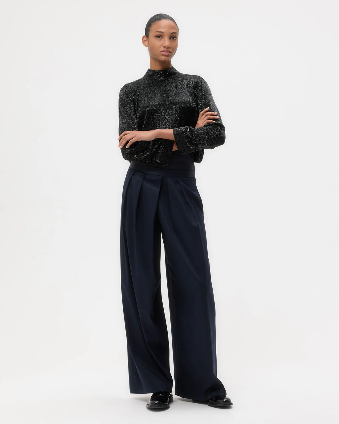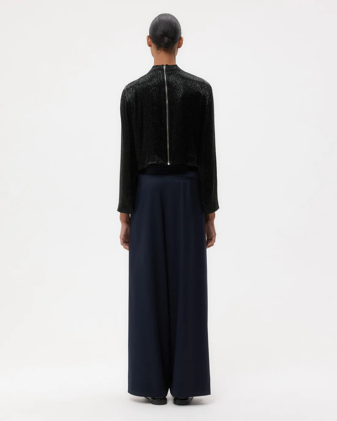 Cropped, long-sleeve top lined with silk crepe de chine and fully embellished with crystals. Fabric is lightweight with a textured sparkle finish. The Reversible Topper features a mock neckline and a straight fit through the body. Complete with an exposed back zipper, raw hem, and raw cuffs.