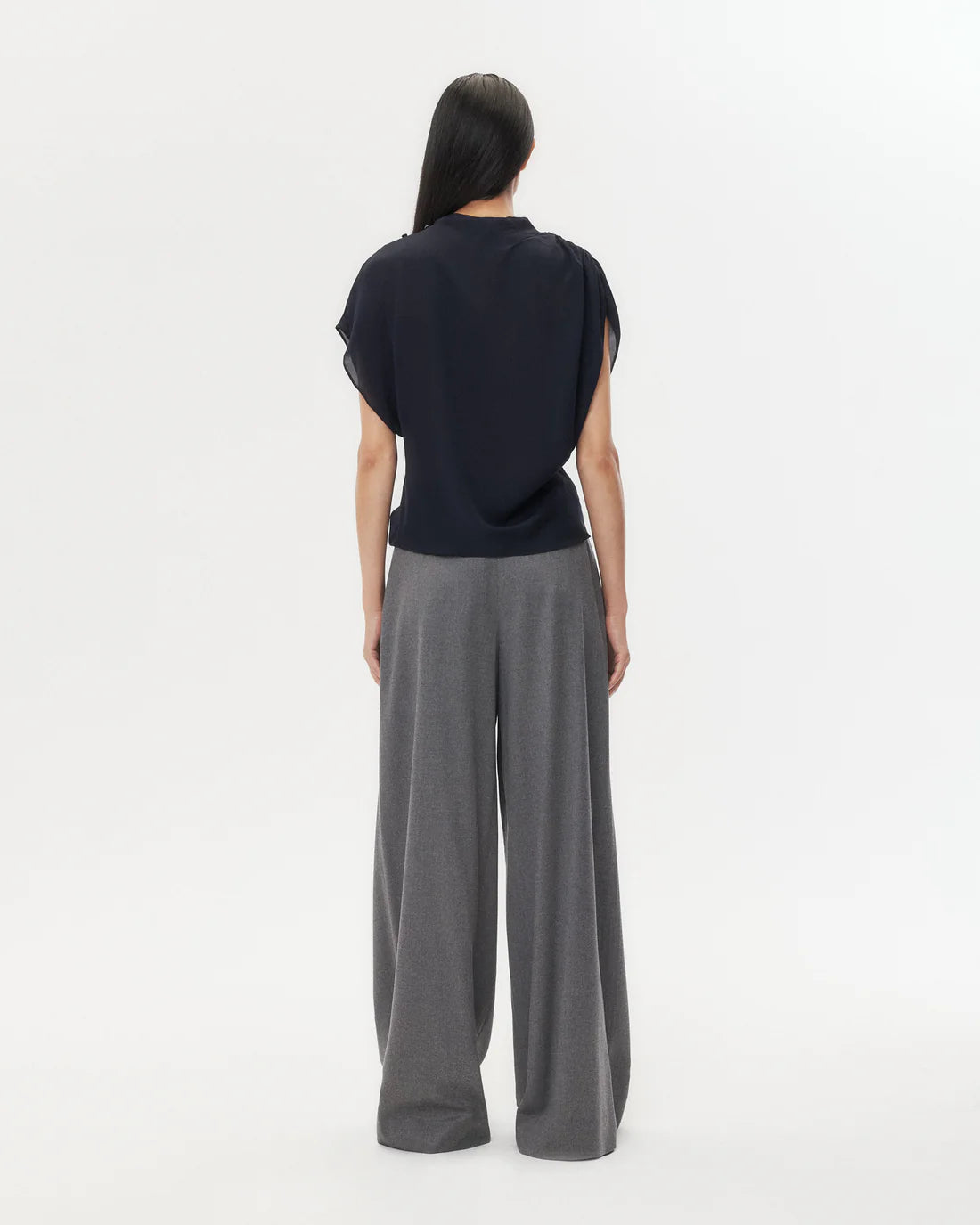 Mock neck, cap sleeved blouse draped in supple lamb leather finished on both sides. Loose fit, with a soft drape that skims the body. Complete with a placket trim on one shoulder and pleats on the other shoulder.