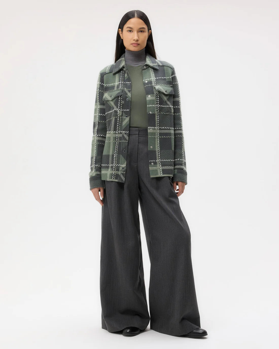 Plaid cardigan knitted in give-gauge cashmere. Our cashmere is spun at an Italian heritage mill from single-origin yarns sourced for their unparalleled softness. The Rancher’s Cardigan is a relaxed, medium weight sweater, fully fashioned at the sleeves, cuffs and collar. With western inspired details: a snap placket, chest flap pockets and exposed yoke. Complete with a collar and snaps at the cuffs.