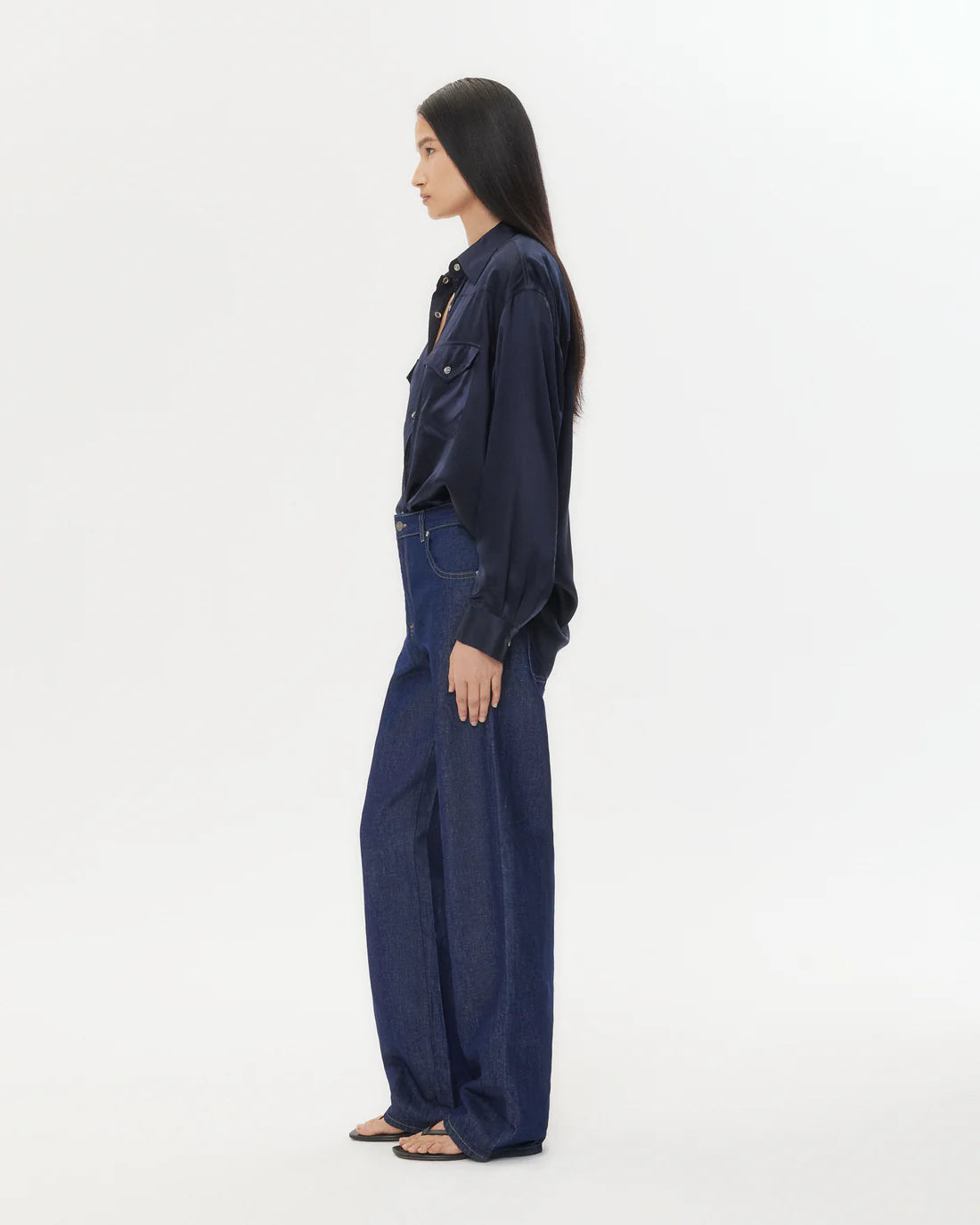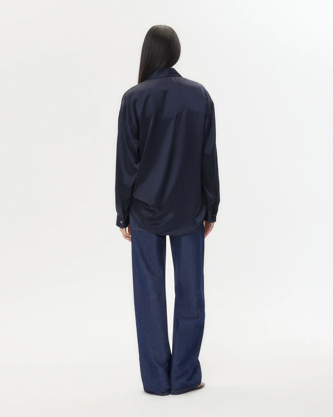 Oversized, western inspired work shirt in glossy and sleek silk charmeuse. The Dutton has utility details: chest flap pockets, a snap button placket and front yoke. Complete with button cuffs and contrast stitching at the seams.