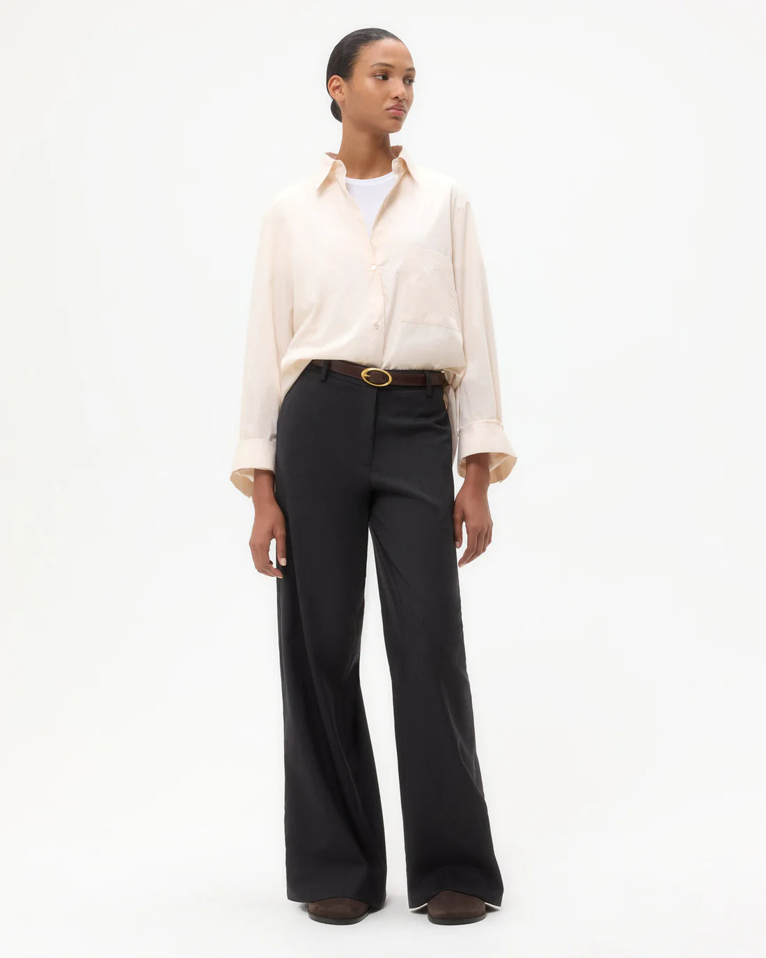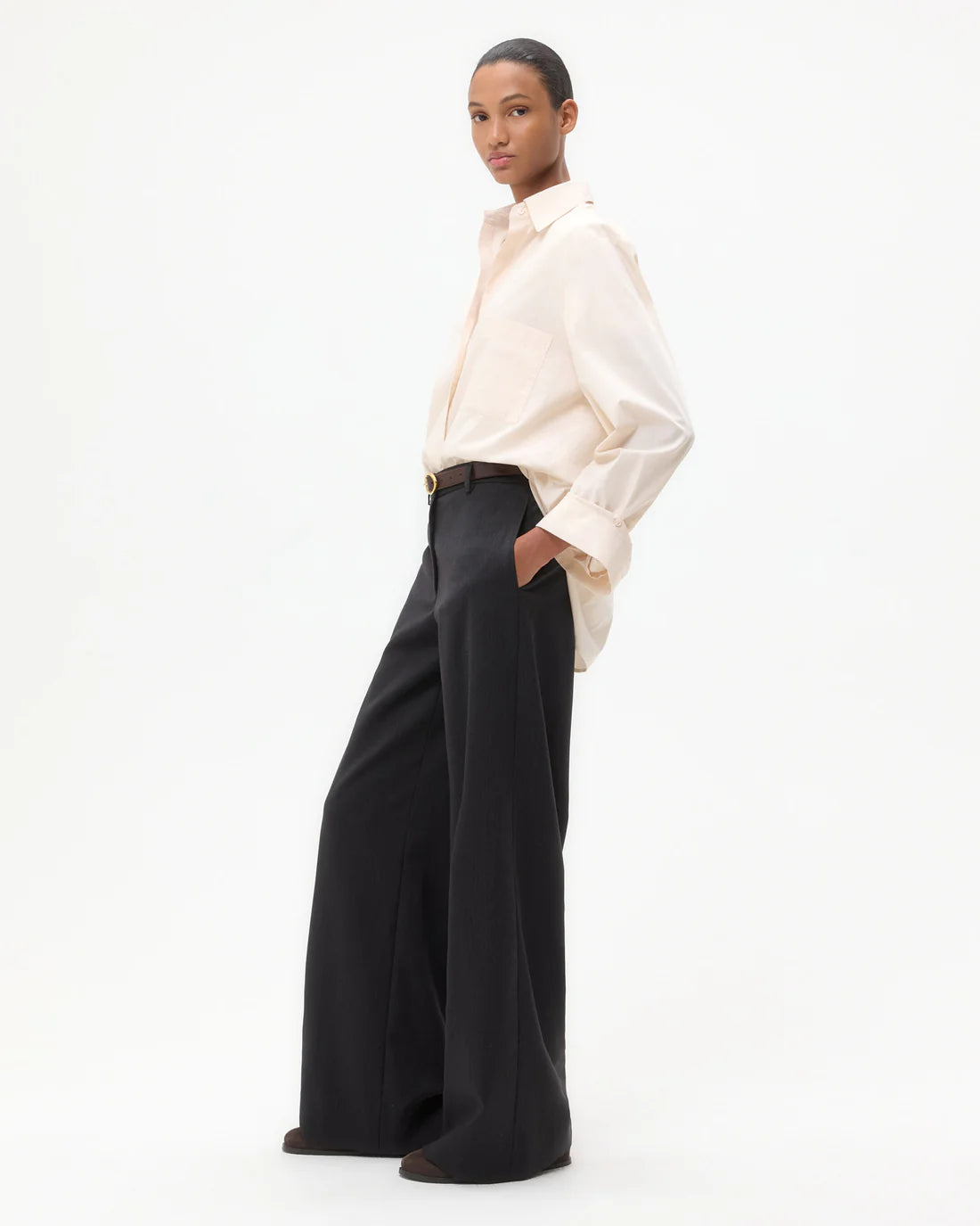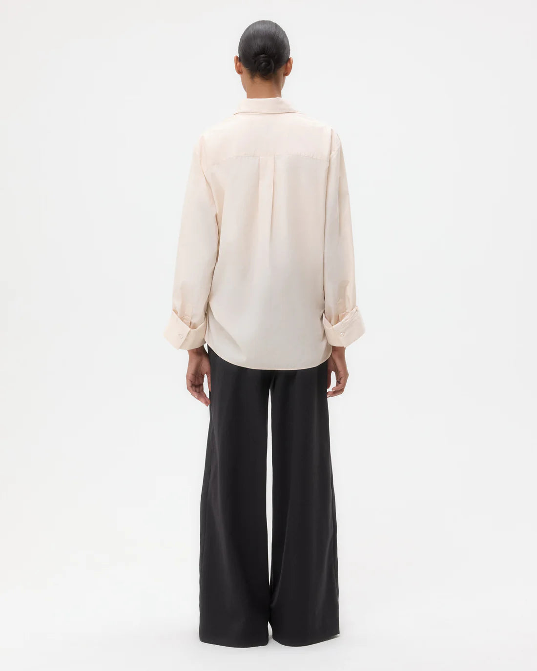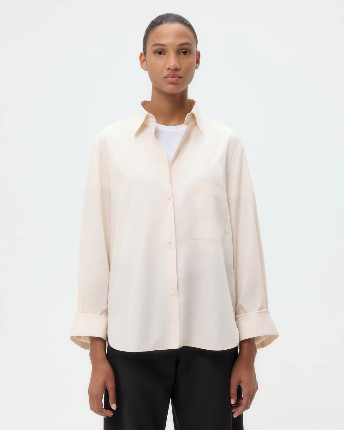 Oversized button down shirt in superfine Italian cotton shirting. The Next Morning is a relaxed silhouette with a center box pleat at the back. Complete with an exposed button up placket, chest patch pocket, spread collar and single roll button cuffs.