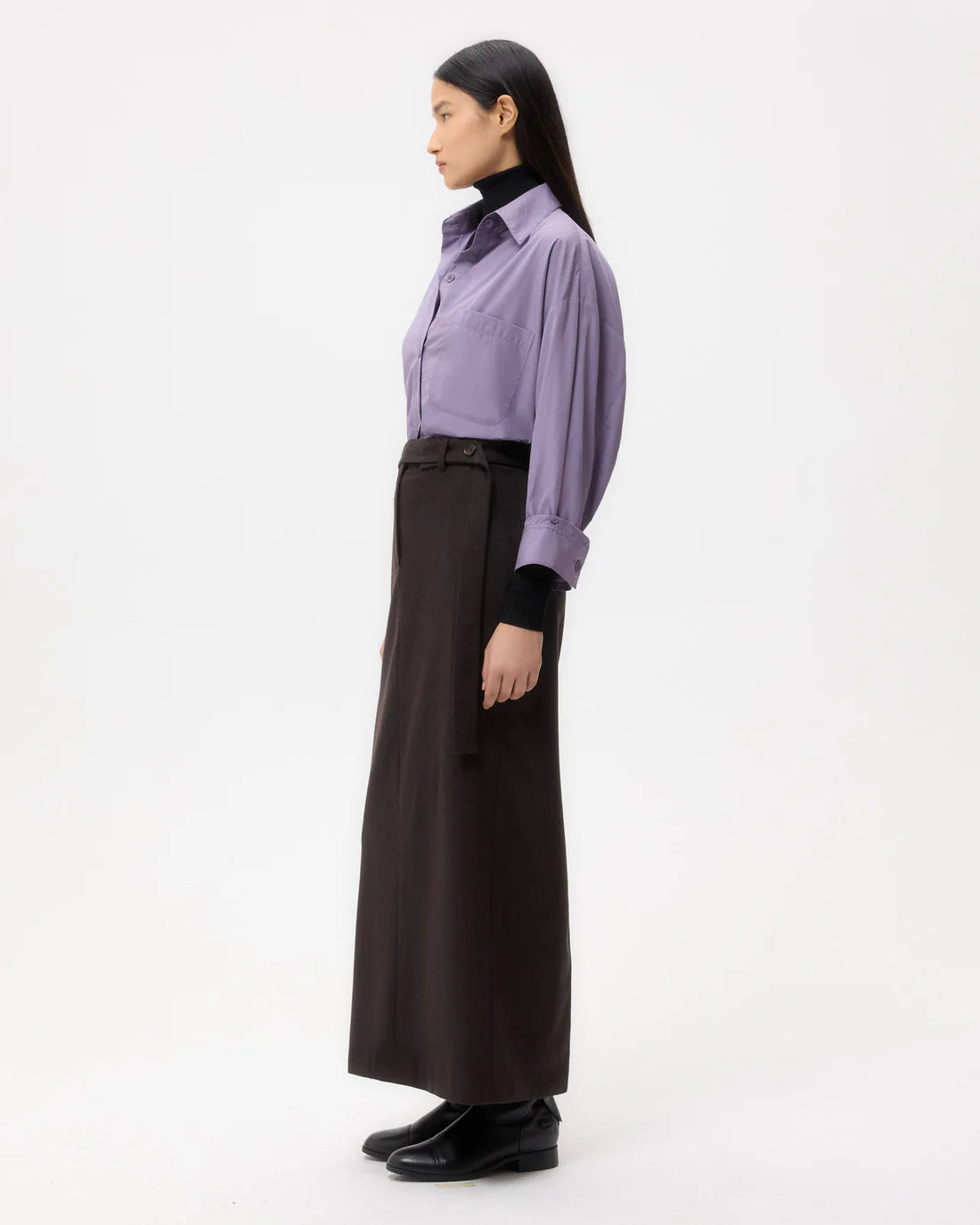 Oversized button down shirt in cotton poplin. This fabric is a smooth, more structured poplin, in a plain weave, developed for effortless wear. The Earl is a relaxed shirt featuring an asymmetric button front. Complete with a spread collar, chest patch pocket, back yoke, box pleat at the back, and single roll button cuffs.