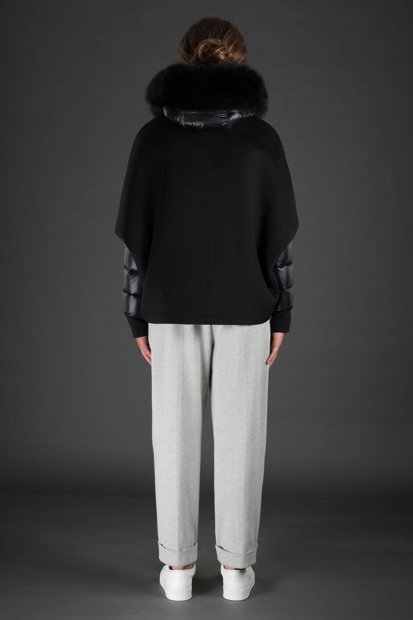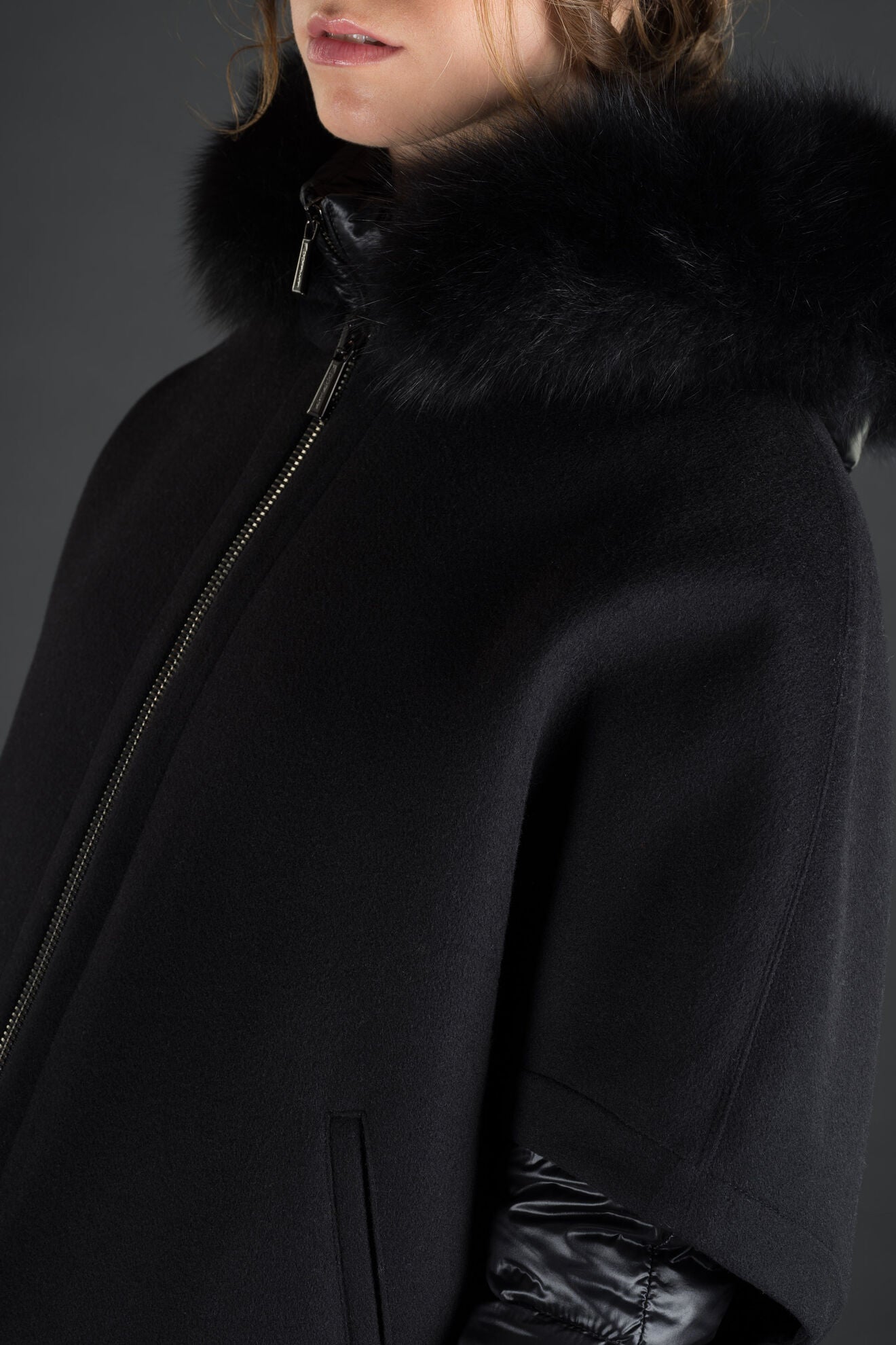 The outer cape, versatile and refined, is made from warm double wool blended with cashmere.